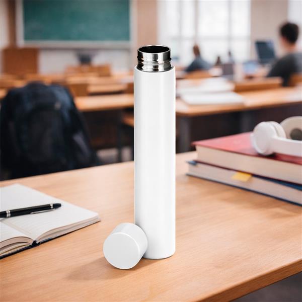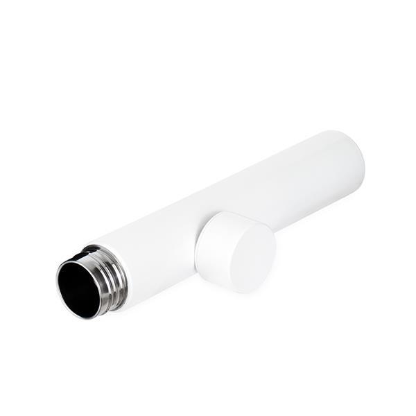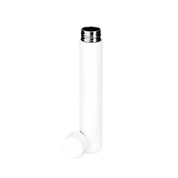 Garrafa em inox 304 com tampa rosqueável e capacidade para até 250 ml.