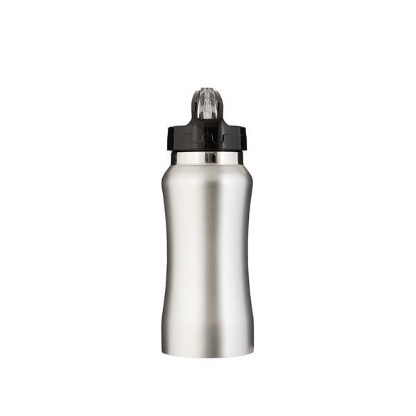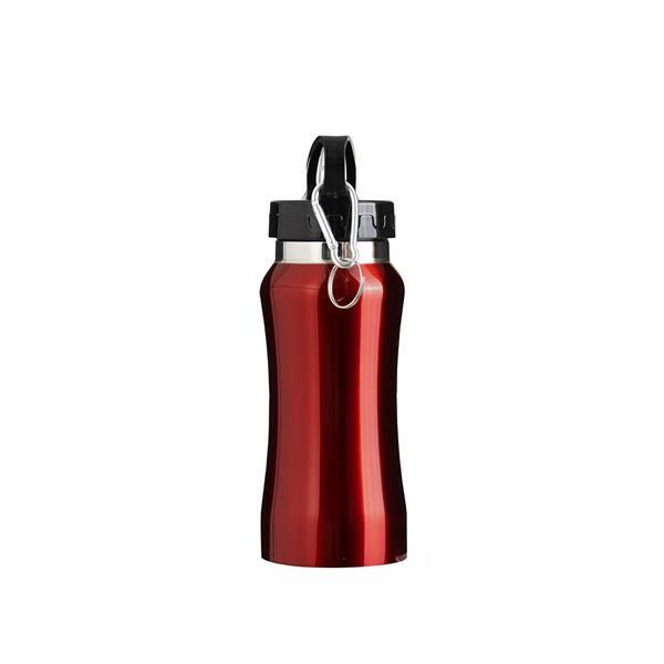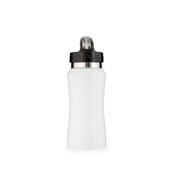Squeeze em inox com capacidade para até 500 ml. Possui tampa rosqueável em plástico com alça fixa e bico flip. Acompanha canudo interno removível e mosquetão metálico com argola.