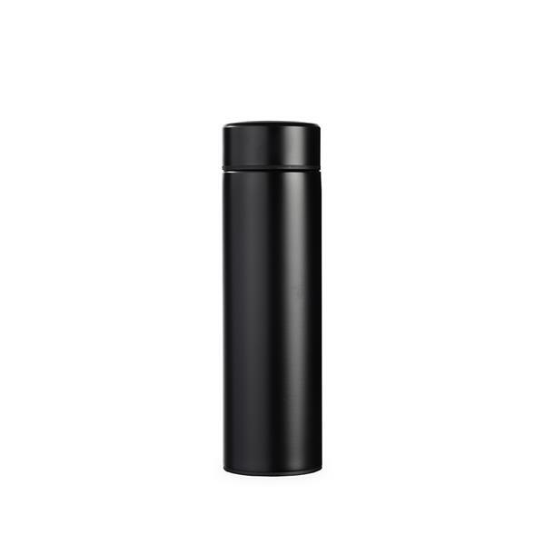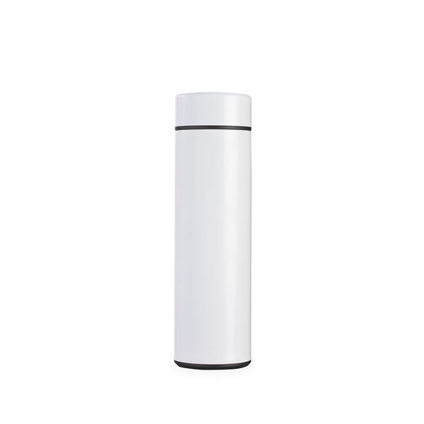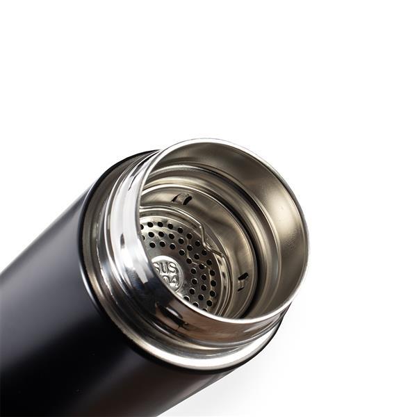 Garrafa térmica de parede dupla, com parte externa em inox 201 e pintura aplicada por spray, e camada interna em inox 304. Possui capacidade de até 400 ml, tampa rosqueável com parte interna em polipropileno (PP) e anel de vedação emborrachado, além de base antiderrapante em PP. Acompanha cesto infusor com alça em inox 304.