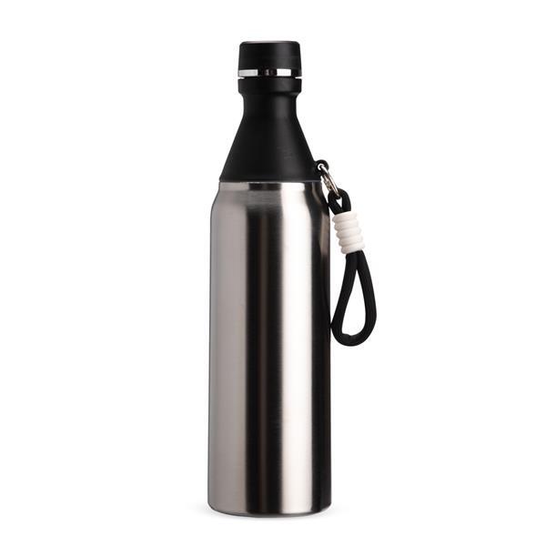 Garrafa térmica em inox com capacidade para até 500 ml. Possui estrutura de parede dupla, ideal para conservar a temperatura de líquidos por mais tempo. Conta com tampa rosqueável e compartimento removível em plástico, permitindo o uso como copo. Acompanha alça em nylon com detalhes em plástico e mosquetão metálico.