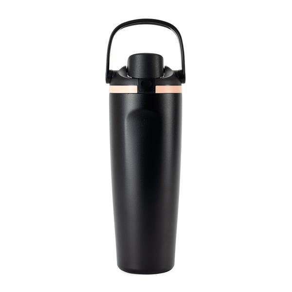 Garrafa térmica em inox com capacidade para até 850 ml. Conta com estrutura de parede dupla e vedação a vácuo, ajudando a conservar a temperatura dos líquidos por mais tempo. Possui tampa rosqueável em plástico com protetor para o bocal, botão de acionamento, trava de segurança e alça de mão para transporte. Acompanha canudo para encaixe interno na tampa.