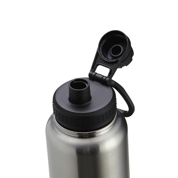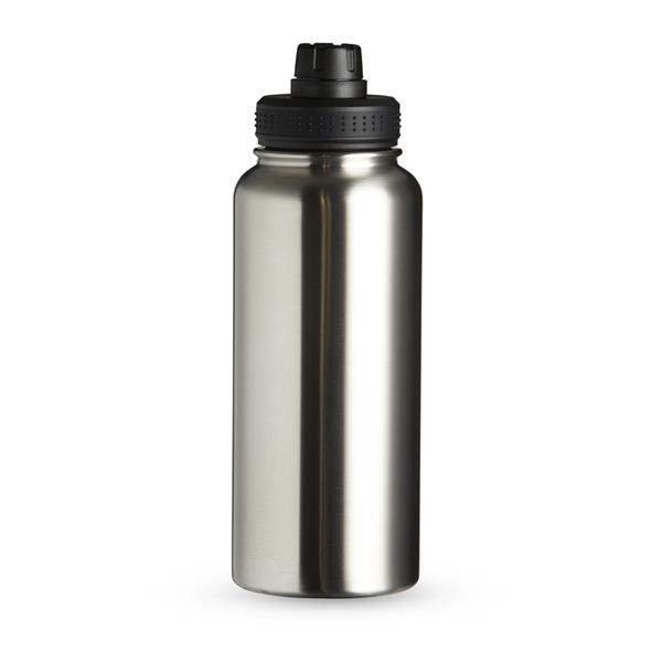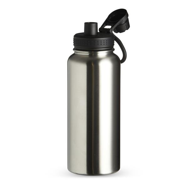Garrafa térmica com capacidade de 1 litro em inox com parede dupla, contém tampa plástica rosqueável com bocal e alça para transporte acoplados.