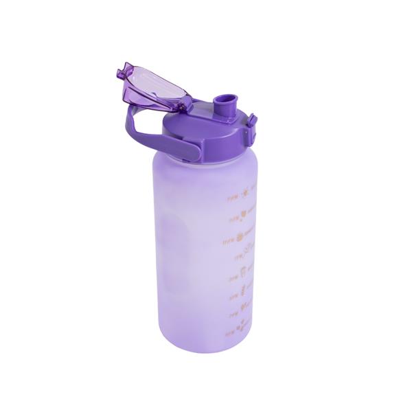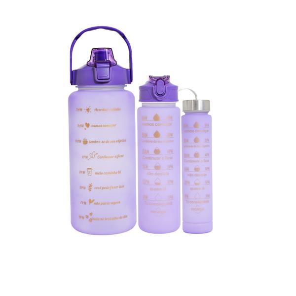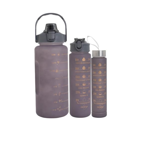 Kit com 3 garrafas plásticas, sendo um squeeze galão com capacidade de 2 litros, squeeze 750ml e garrafa 300ml. Squeeze 2L com alça para transporte e suporte para celular, botão de acionamento e tampa de proteção para o bocal; squeeze 750ml com botão de acionamento, trava de segurança e tampa protetora para o bico de silicone; garrafa 300ml com tampa de alumínio e alça de nylon para transporte. Acompanham dois canudos e acessórios de extensão de canudo.