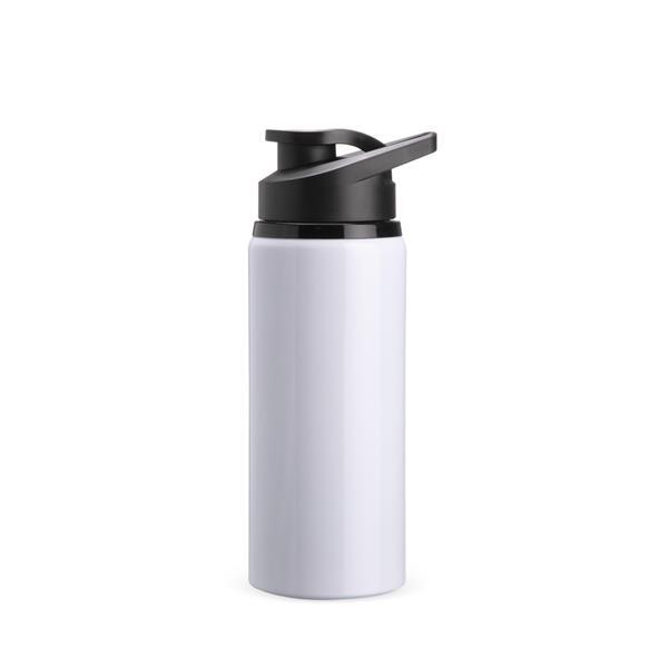 Squeeze em alumínio com pintura de acabamento brilhante e capacidade máxima de 650 ml. Possui tampa rosqueável em plástico com alça fixa e tampa protetora para o bocal.