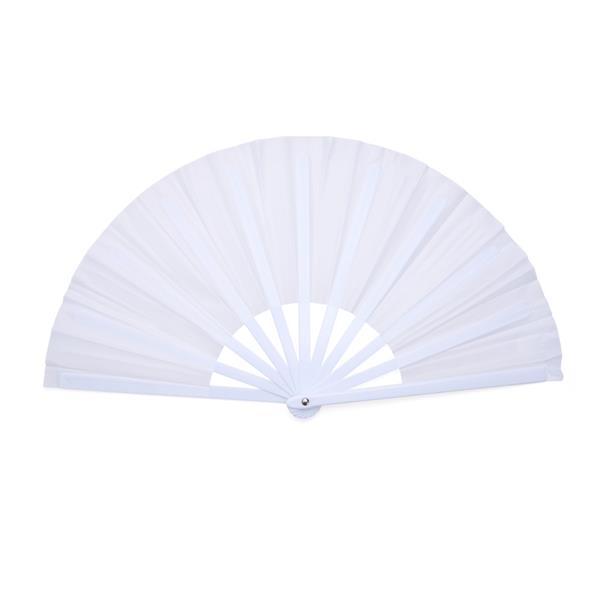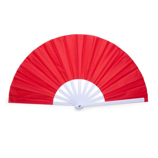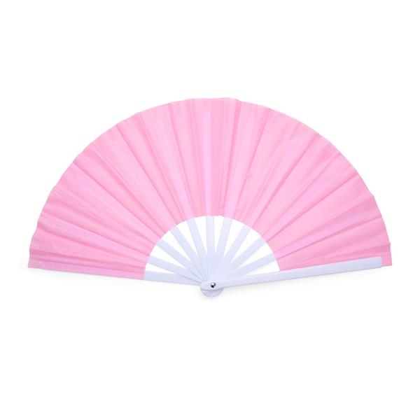 Leque com estrutura resistente em plástico e tecido leve.