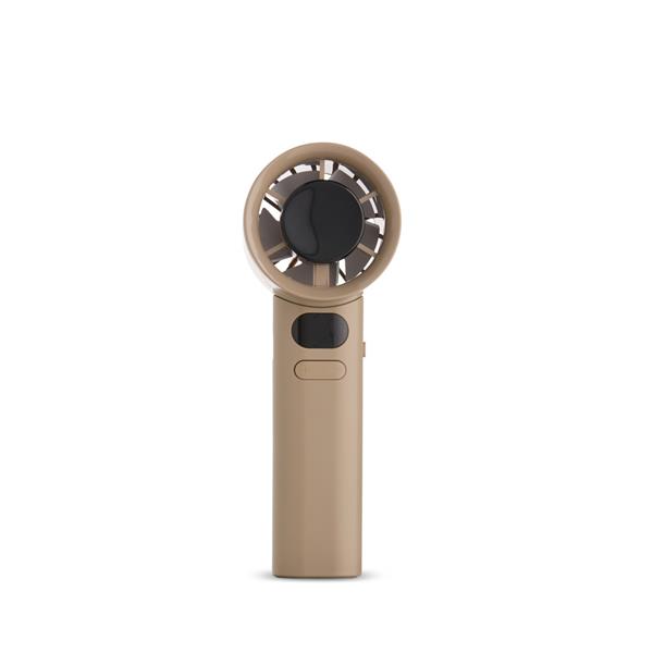 Mini ventilador recarregável em plástico e metal. Possui controle de velocidade ajustado por botões frontais, acionamento por chave seletora e painel de LED que exibe níveis de velocidade e carga da bateria. Acompanha cabo USB-C e cordão em nylon.