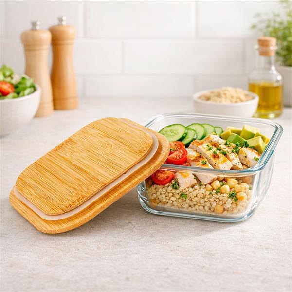 Marmita em vidro borossilicato com capacidade para at. Possui tampa hermética em bambu. Aviso:  Retire a tampa da marmita antes de levá-la ao micro-ondas. Marmita versátil para freezer e micro-ondas.