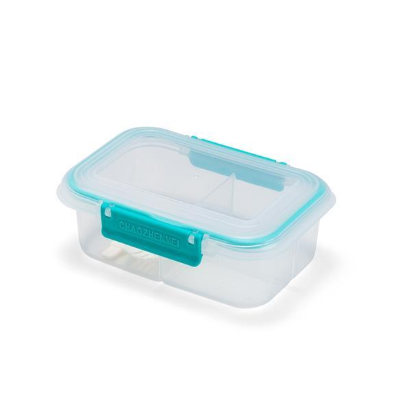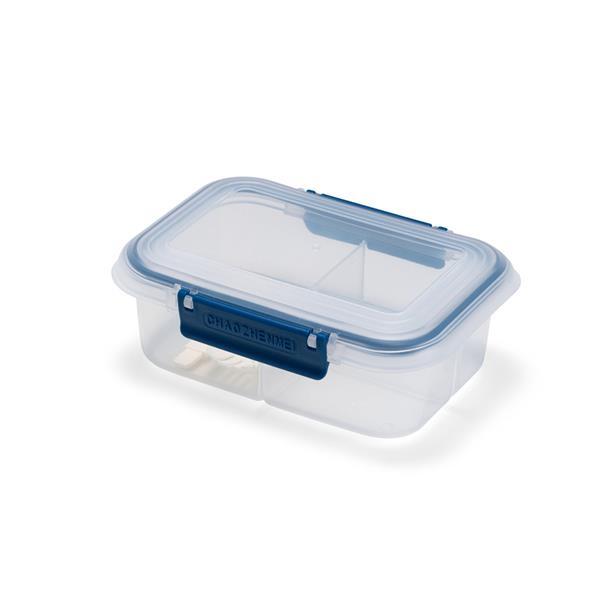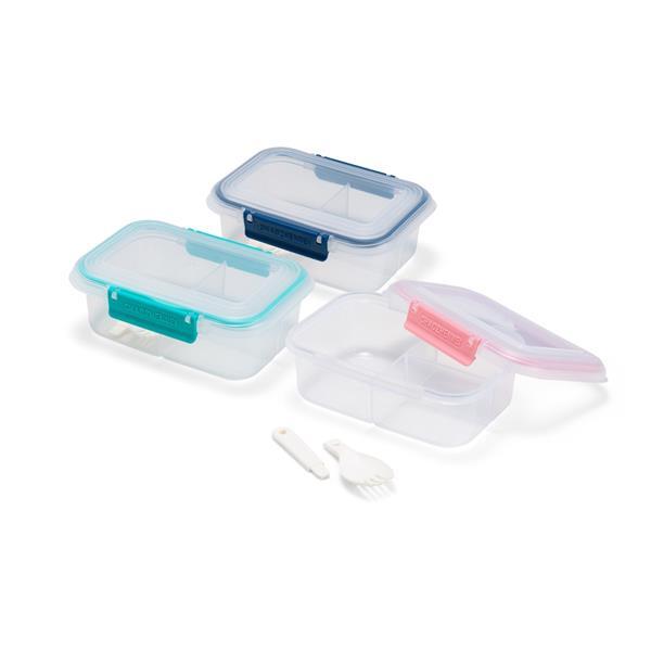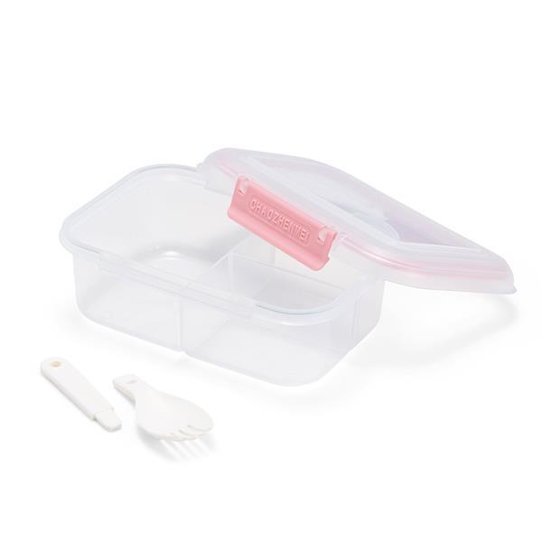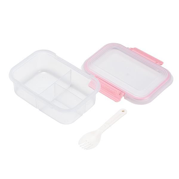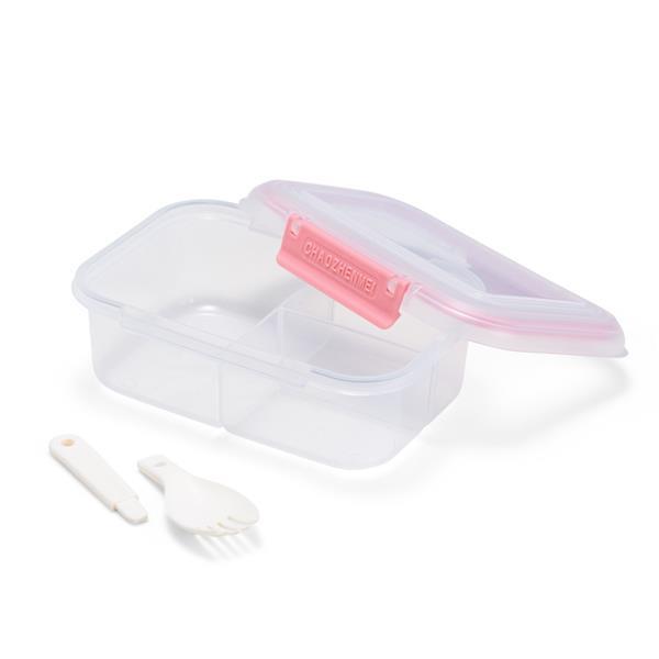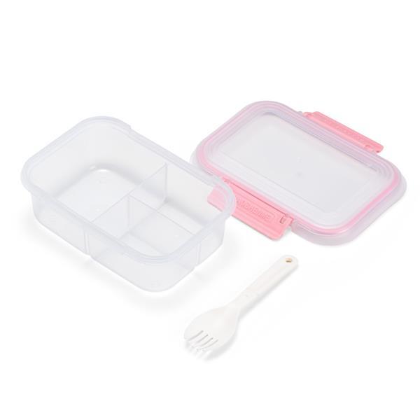 Marmita em plástico polipropileno (PP) livre de BPA com capacidade máxima de 650 ml. Possui três divisórias fixas, tampa hermética com anel de vedação em silicone e duas travas laterais. Acompanha colher tipo spork em PP. Altura : 6,6 cm Largura : 17,6 cm Profundidade : 8,5 cm Peso aproximado (g): 130