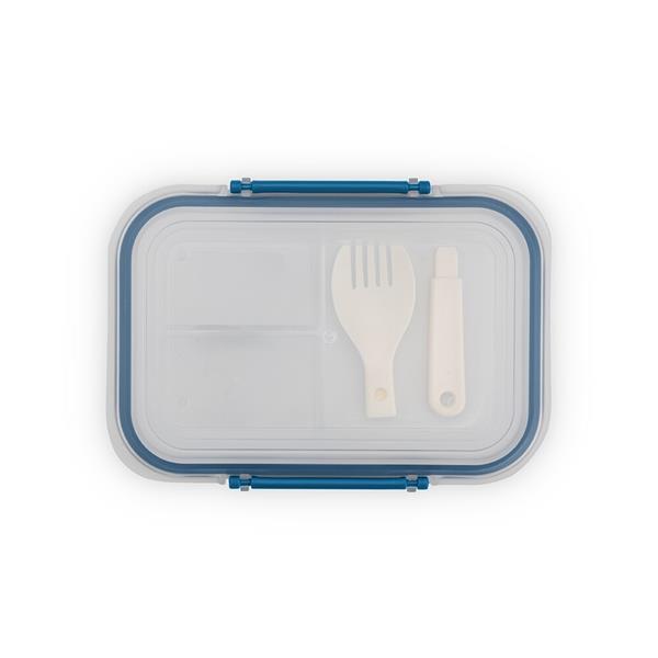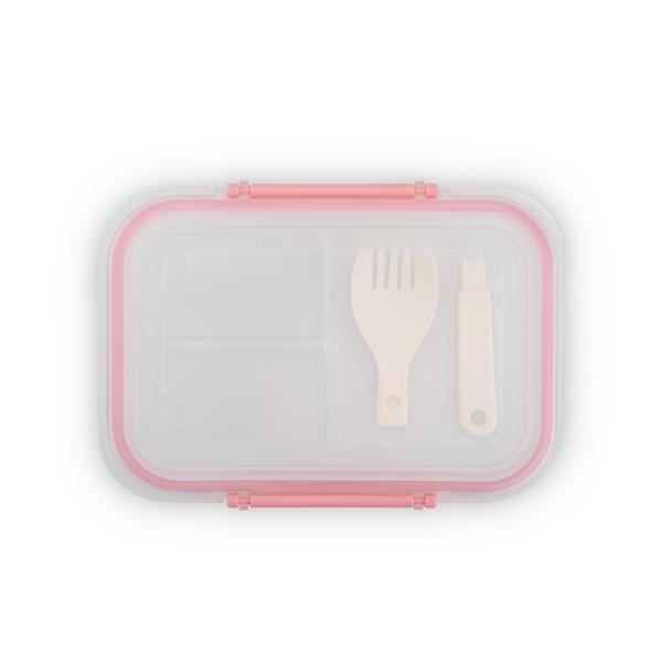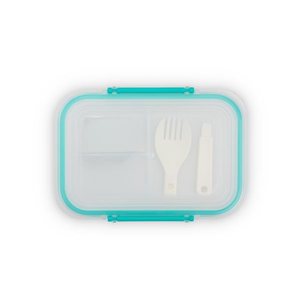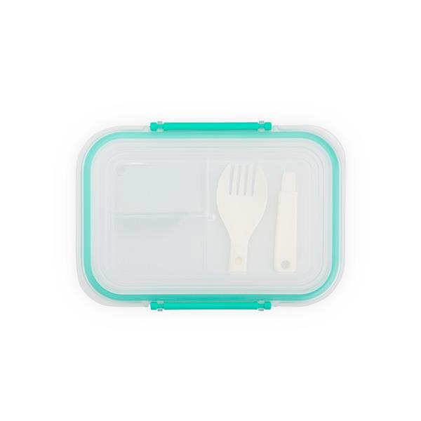 Marmita em plástico polipropileno (PP) livre de BPA com capacidade máxima de 650 ml. Possui três divisórias fixas, tampa hermética com anel de vedação em silicone e duas travas laterais. Acompanha colher tipo spork em PP.