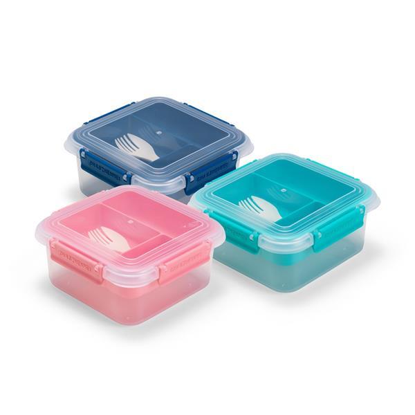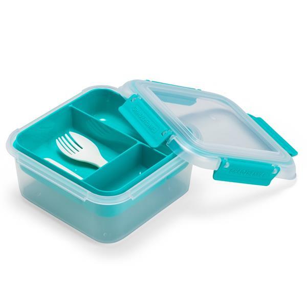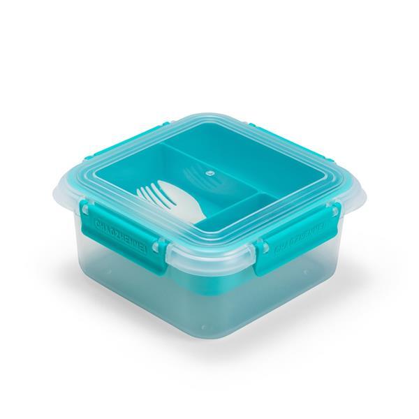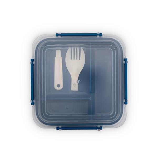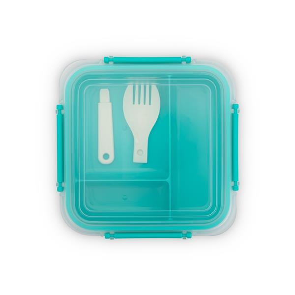 Marmita em plástico polipropileno (PP) livre de BPA com capacidade máxima de 1 litro combinada com a divisória removível. Possui tampa hermética com anel de vedação em silicone e quatro travas laterais. Acompanha colher tipo spork em PP. Altura : 7,9 cm Largura : 16,7 cm Profundidade : 12 cm Peso aproximado (g): 216