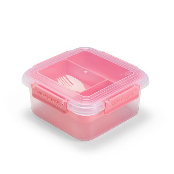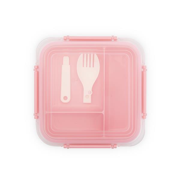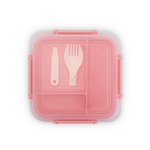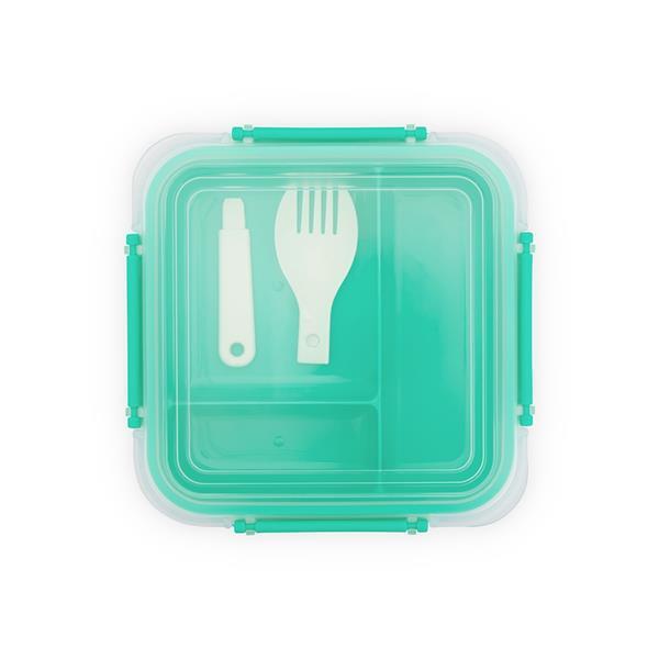Marmita em plástico polipropileno (PP) livre de BPA com capacidade máxima de 1 litro combinada com a divisória removível. Possui tampa hermética com anel de vedação em silicone e quatro travas laterais. Acompanha colher tipo spork em PP.