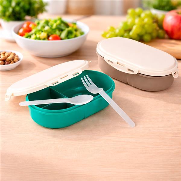 Marmita em plástico polipropileno (PP) livre de BPA com capacidade máxima de 650 ml. Possui tampa com travas laterais para fechamento e três divisórias fixas. Acompanha colher e garfo em PP. OBS: Capacidade de 750 ml quando enchida até o limite das divisórias