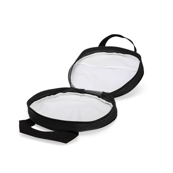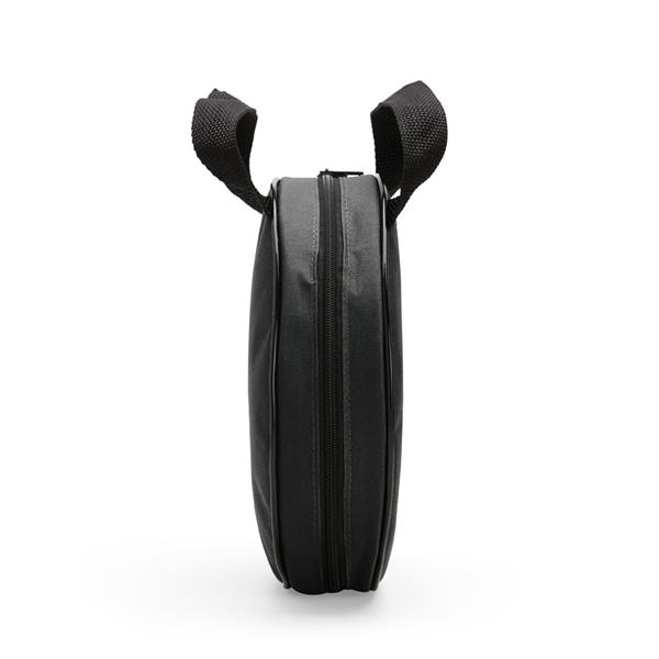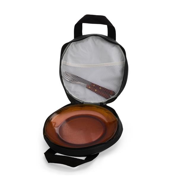 Bolsa porta-pratos confeccionada em poliéster 600 impermeável, com fechamento em zíper e compartimento interno que inclui bolso em tela de nylon. Possui duas alças de nylon para transporte.